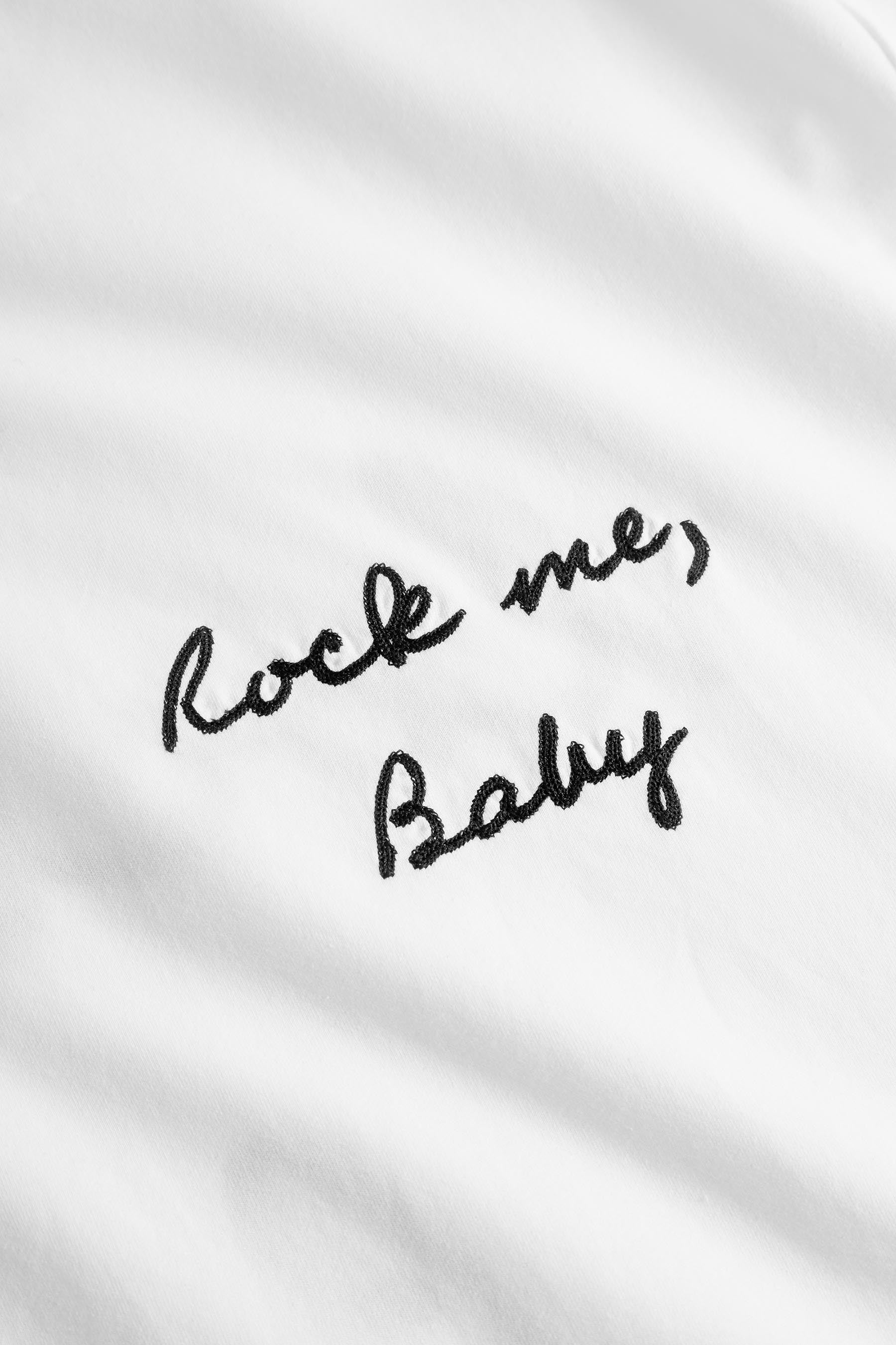 - “Rock me, baby” geborduurd in sierlijk stiksel